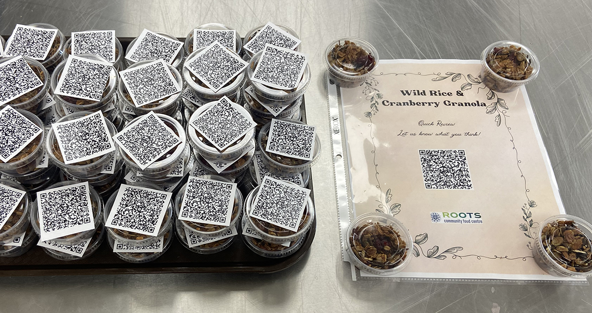 In June, the focus shifted to a recipe inspired by The Sioux Chef’s Indigenous Kitchen by Beth Dooley and Sean Sherman. The granola recipe celebrated locally available foods and highlighted ingredients that can be foraged or grown in Northwestern Ontario. The Roots team decided to substitute the original popped amaranth with puffed manoomin, adding a unique regional twist.
