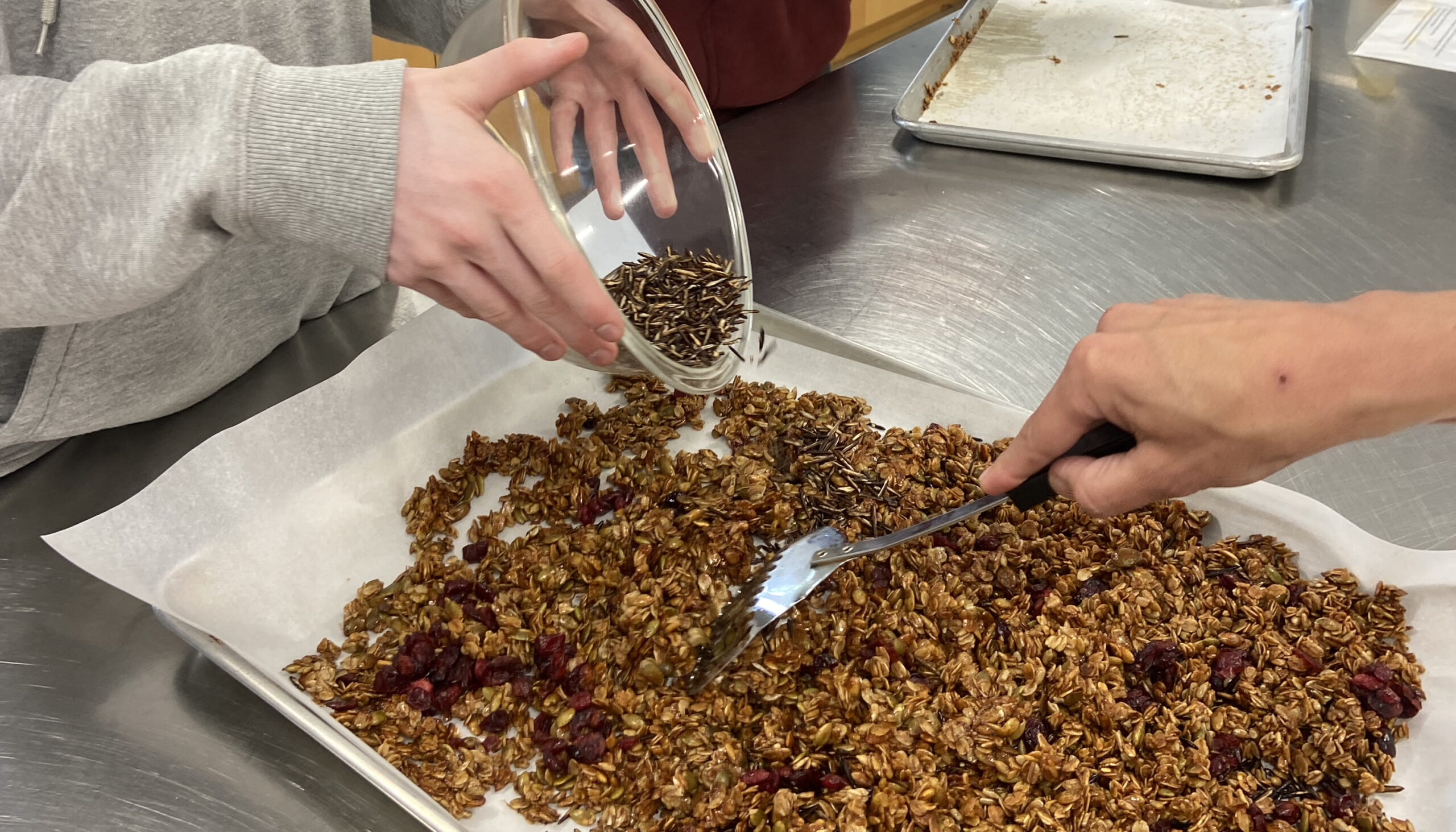 Once prepared, the Wild Rice and Cranberry Granola was stored and packaged in reusable containers, using the same eco-friendly packaging as other Roots granola products. Students and staff collaborated to portion and label the granola, which was then sold in the GFC as a nut-free option alongside yogurt parfaits or as a standalone snack. For the rest of the school year, it became a popular choice among students.