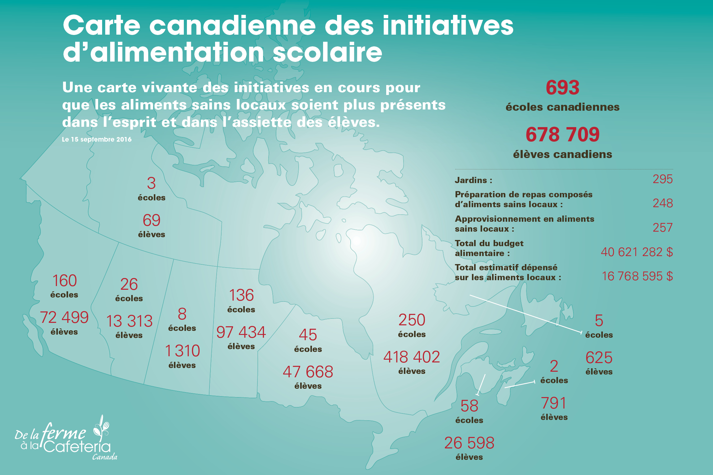 La carte de l’alimentation scolaire du Canada, réalisée par F2CC, a été dévoilée durant l’événement Changing the Menu. Elle a été conçue afin de documenter les activités réalisées à travers le pays afin d’offrir aux élèves des aliments sains, locaux et durables à l’école.